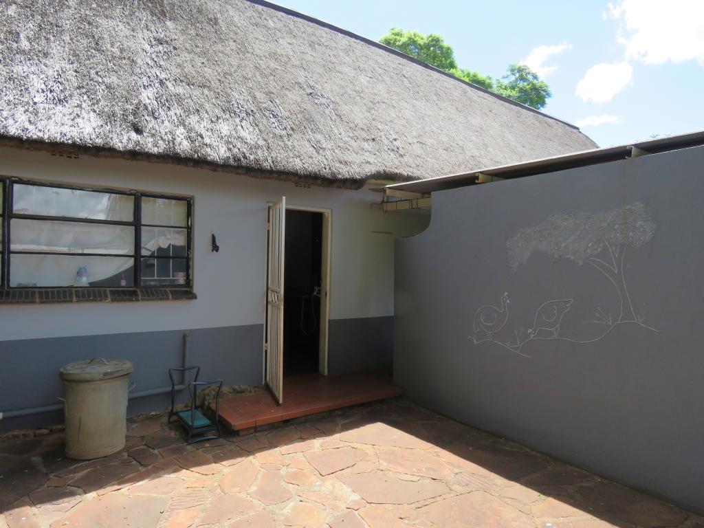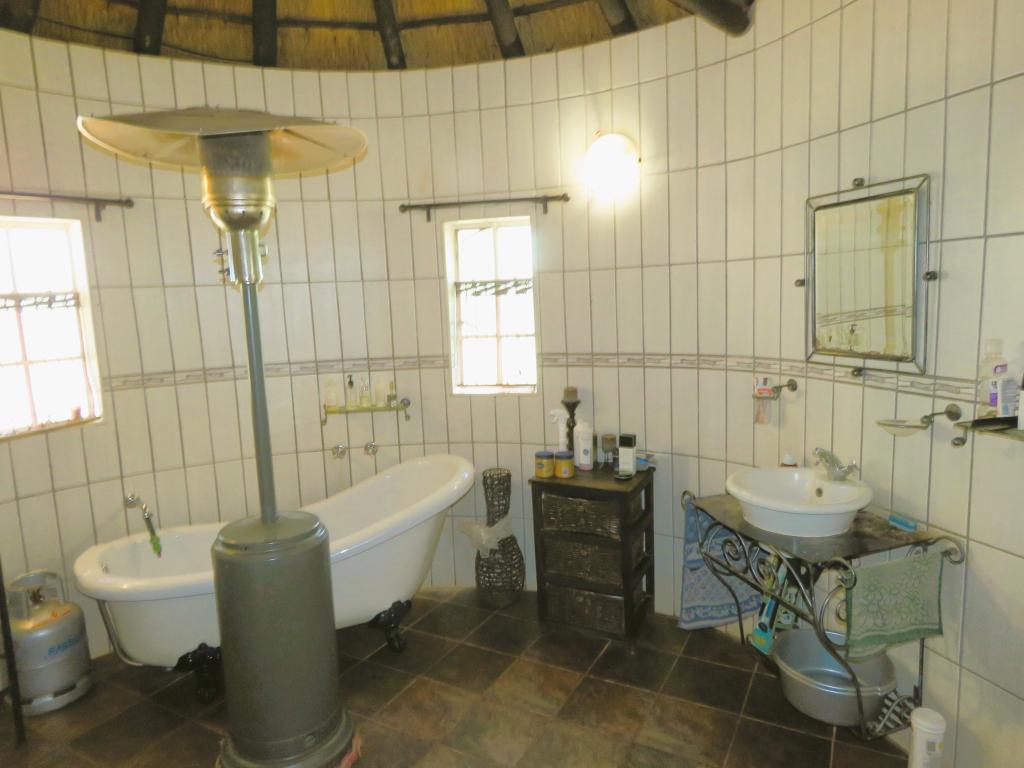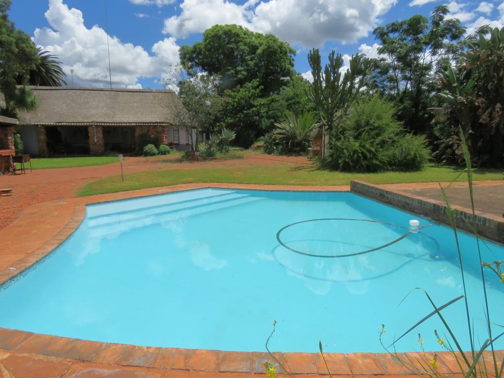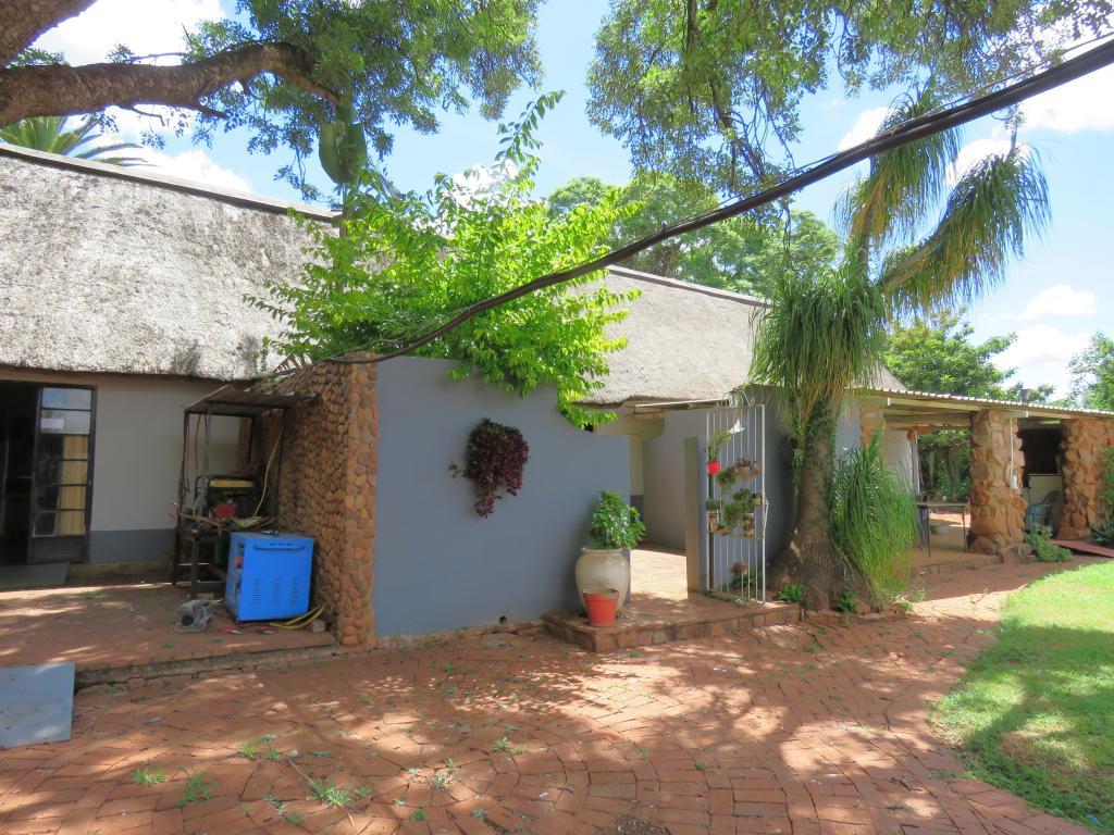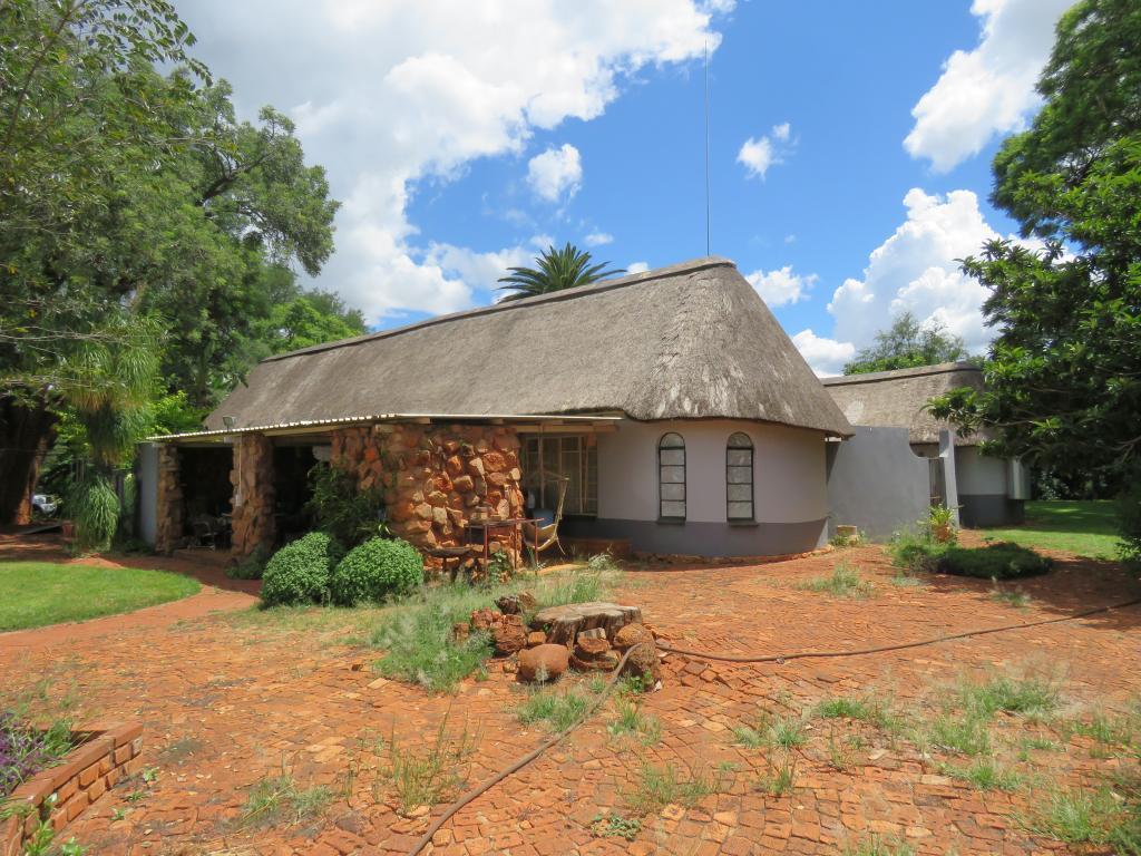 | Description: | Experience freedom and peace on this 12.8 ha piece of land. Main features: Bordering town area, the location is ideal. 16 Solar panels, 3 batteries and 8 KVA inverter for main house. Borehole provides for home and gardening purposes. Flowing gardens with irrigation. Cameras on premises, as well as security lights and outside beams. Other features outside: Cattle fence around property Swimming pool with pump Carport for 5 vehicles, and paved driveway. Garage or workshop (fits 6 vehicles) Large shed Water tank on stilts Outside room & bathroom Veld, camps and stable. Main house: Lovely, thatched roof house with large front stoep. Tiled floors Lounge and dining room Kitchen with electric stove, scullery and pantry Study 2 Bathrooms 2 Bedrooms. Master bedroom with change room, air conditioning and en suite. Stoep at the second entrance, with covered patio 1st Garden flat Open plan with space for bedroom, kitchenette and living area. Bathroom 2nd Garden flat Living area, kitchenette, bedroom and bathroom. Second entrance with garages. |