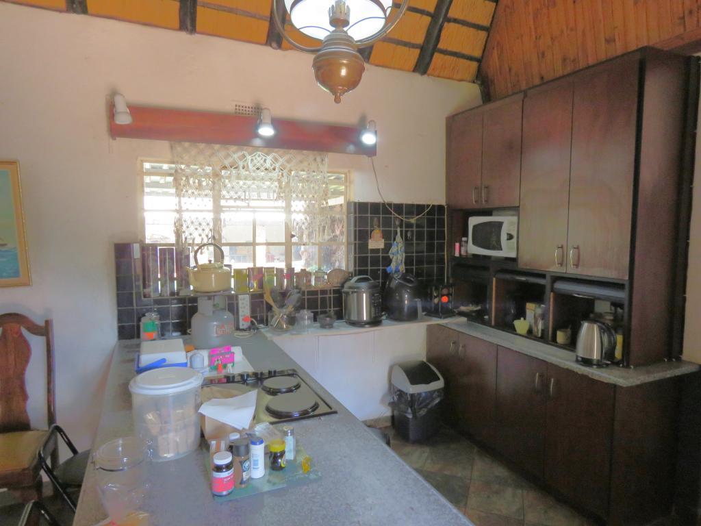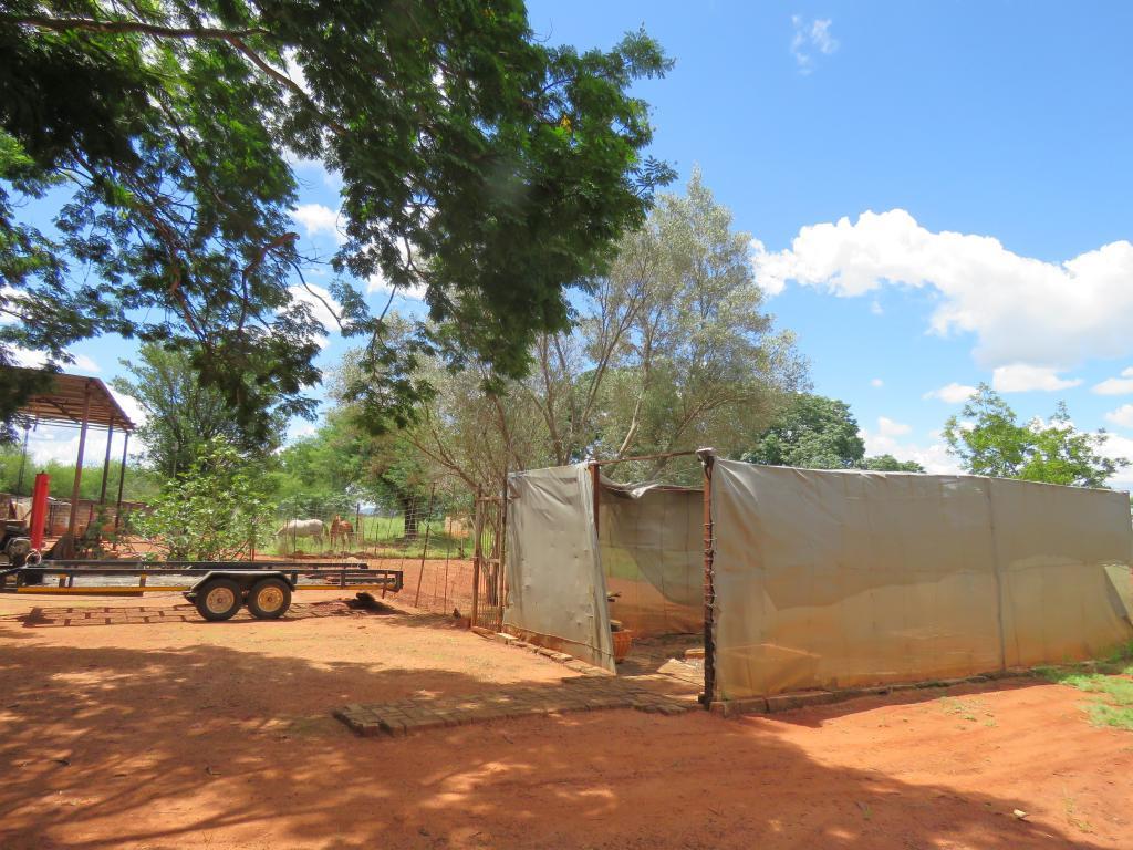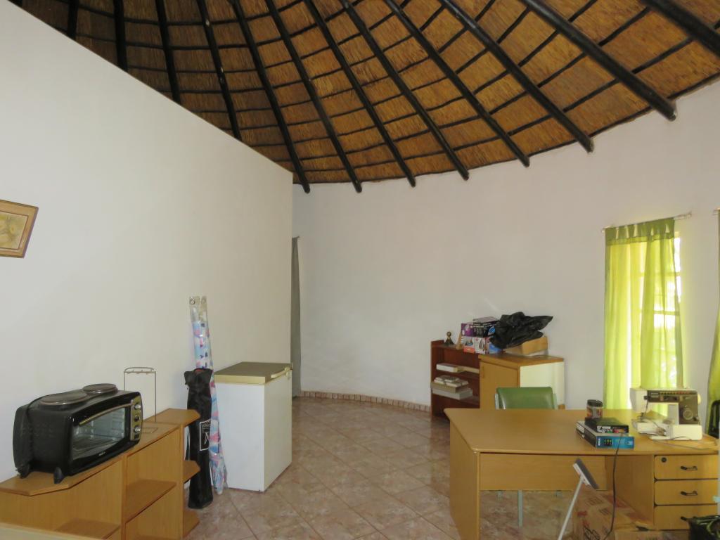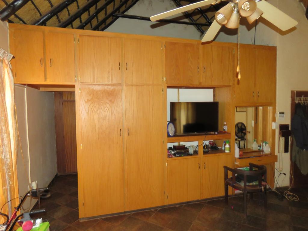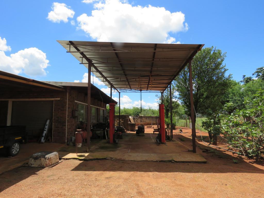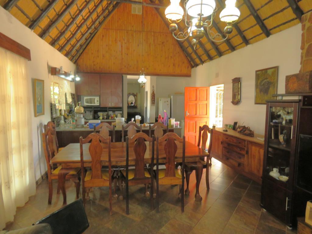 | Description: | Experience freedom and peace on this 12.8 ha piece of land. Main features: Bordering town area, the location is ideal. 16 Solar panels, 3 batteries and 8 KVA inverter for main house. Borehole provides for home and gardening purposes. Flowing gardens with irrigation. Cameras on premises, as well as security lights and outside beams. Other features outside: Cattle fence around property Swimming pool with pump Carport for 5 vehicles, and paved driveway. Garage or workshop (fits 6 vehicles) Large shed Water tank on stilts Outside room & bathroom Veld, camps and stable. Main house: Lovely, thatched roof house with large front stoep. Tiled floors Lounge and dining room Kitchen with electric stove, scullery and pantry Study 2 Bathrooms 2 Bedrooms. Master bedroom with change room, air conditioning and en suite. Stoep at the second entrance, with covered patio 1st Garden flat Open plan with space for bedroom, kitchenette and living area. Bathroom 2nd Garden flat Living area, kitchenette, bedroom and bathroom. Second entrance with garages. |
